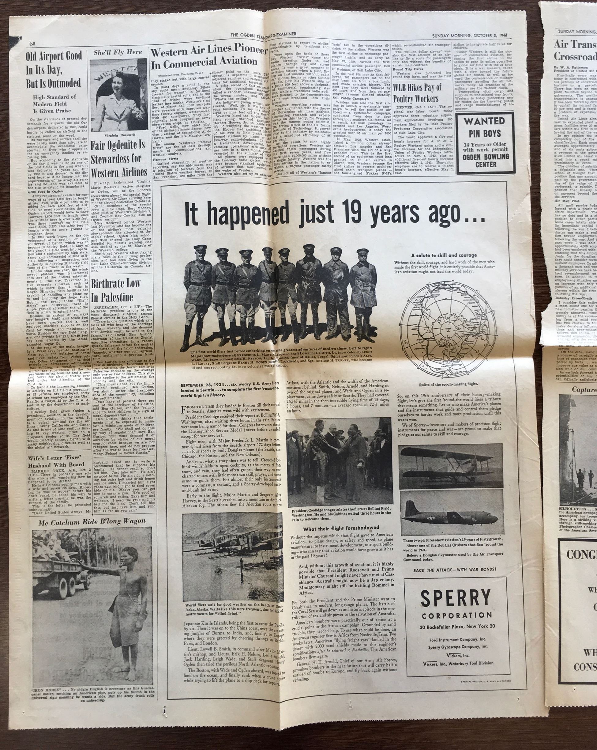 * In 1943, Western Airlines began mail and passenger service from Ogden, with United Airlines providing service in 1946. Both services ended in 1960 due to poor demand.